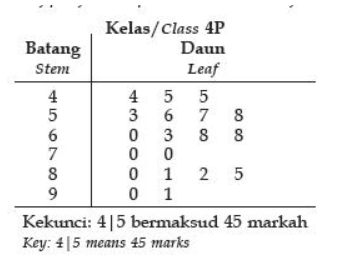 Memaparkan batang dan daun menganjurkan data supaya pengagihan skor seluruhnya cepat dan mudah difahami. Plot batang dan daun adalah cara yang berguna untuk mengatur data sambil tetap mempertahankan semua nilai data, seperti untuk nilai ujian kelas siswa. Diagram batang daun ini menjelaskan bagaimana pembaca mudah memahami data yang sudah di kalkulasikan kedalam diagram tersebut. Paparan memecahkan setiap skor menjadi dua komponen: Diagram batang daun, biasanya perlu untuk diberi keterangan dan kunci untuk mempermudah interpretasi data.