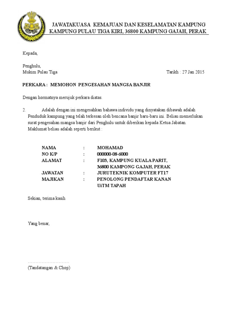 Contoh Surat Pengesahan Mangsa Banjir from imgv2-2-f.scribdassets.com Sukacita adalah dimaklumkan bahawa penama dan butir butir di bawah ini adalah staf di sekolah ini :nama no kad. Beliau juga bebas dari sebarang tindakan disiplin atau menunggu. Contoh surat pengesahan majikan english. Surat gugatan adalah suatu surat yang diajukan oleh penggugat kepada ketua pengadilan yang berwenang, yang memuat tuntutan hak yang di dalamnya mengandung suatu sengketa dan sekaligus merupakan dasar landasan pemeriksaan perkara dan pembuktian kebenaran suatu hak. terkini contoh surat rasmi kebenaran bekerja daripada majikan yang perlu ditunjukkan kepada polis/roadblock ketika pkp atau pkpb. Sebenarnya ada banyak contoh surat perjanjian yang beredar di internet. Surat pengesahan majikan untuk buka akaun bank. Koleksi contoh surat pengesahan majikan & jawatan.
