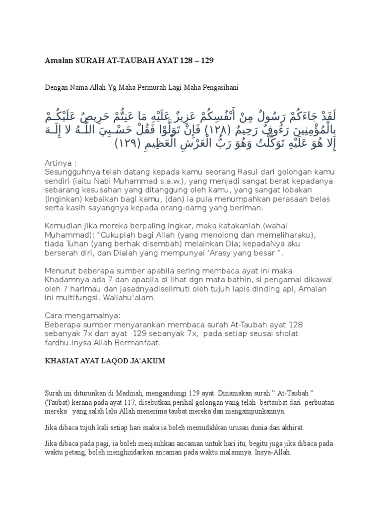 Surah At Taubah Ayat 128 / Surah ini tergolong surah madaniyah yang terdiri atas 129 ayat.. Laqad jaakum rasoolun min anfusikum aaazeezun aaalayhi ma aaanittum hareesun aaalaykum bialmumineena raoofun raheemun. Amalkan 7 kali setiap hari untuk keluar dari kesusahan. Masyaallah!!!amalkan surah at taubah ayat 128 129, ini yg terjadi. Bacalah 7 kali setiap kali selepas solat. Listen surah taubah audio mp3 al quran on islamicfinder.